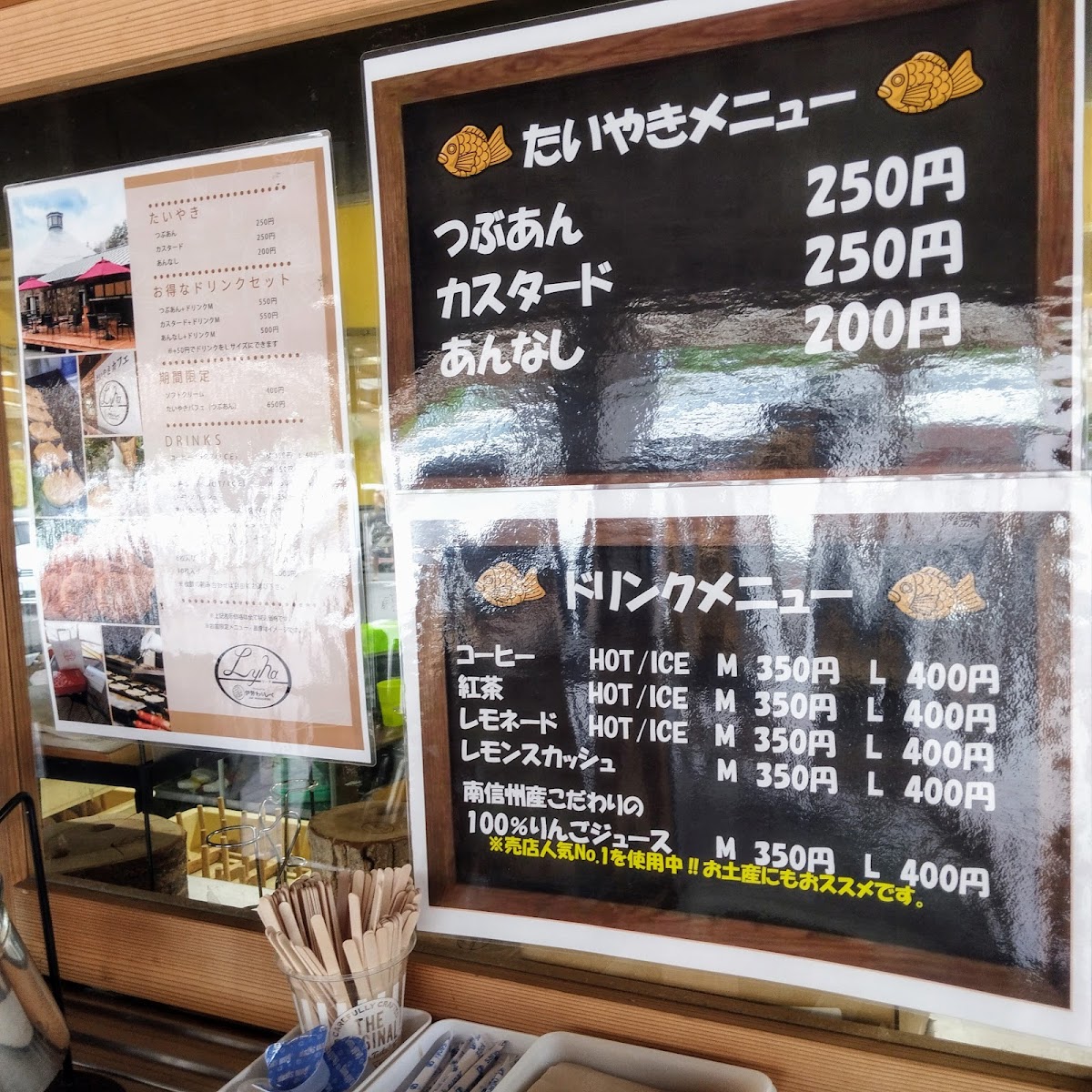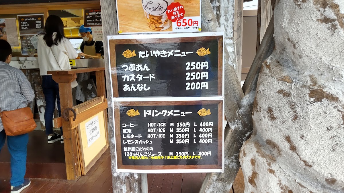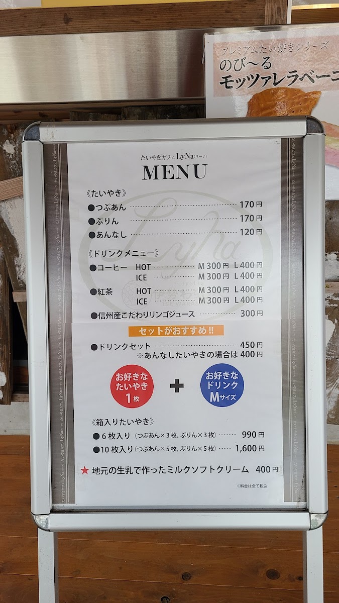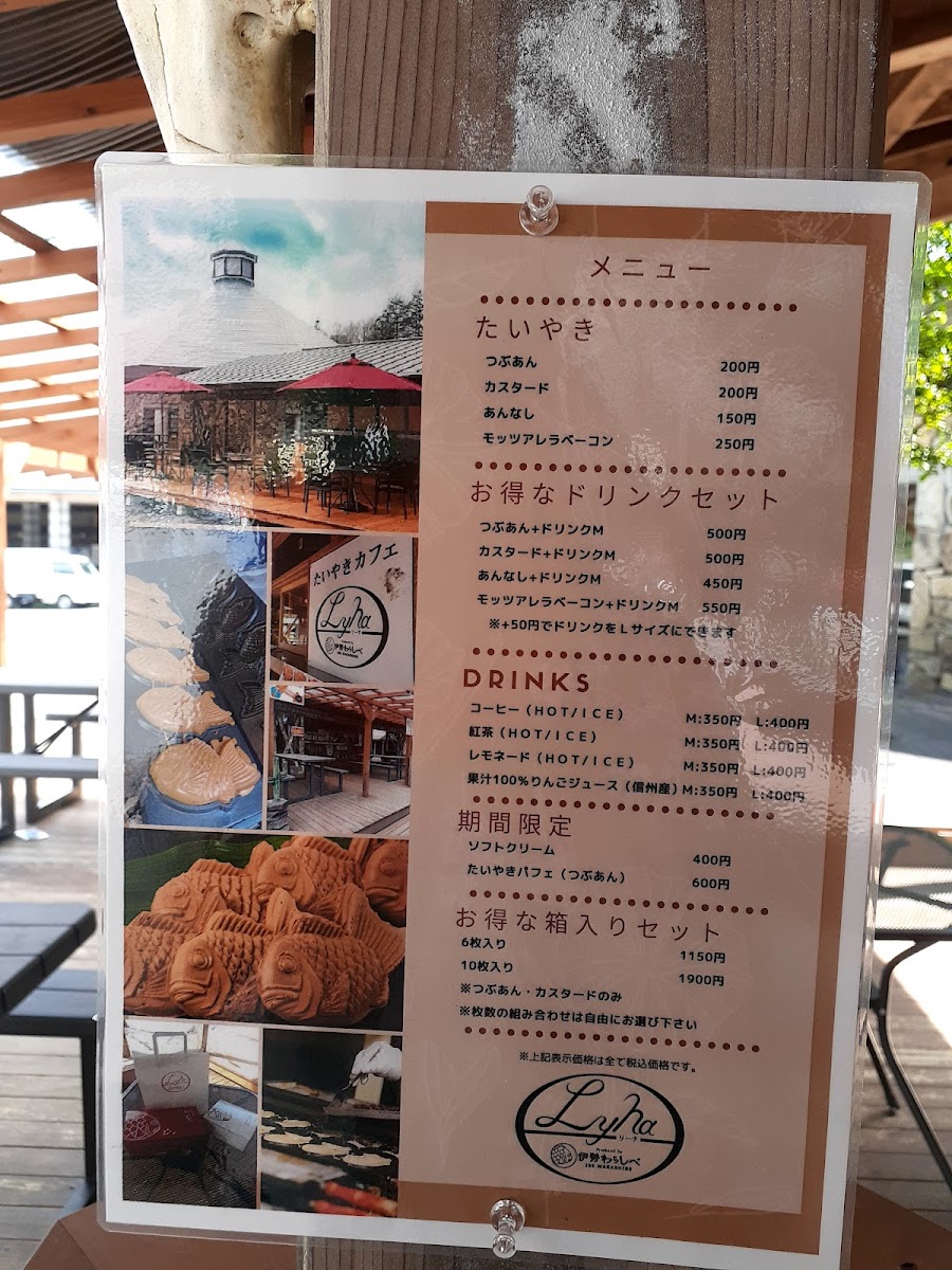 From a reviewer’s perspective, the menu at Taiyaki Cafe Lyna offers a charming and focused selection that highlights both traditional flavors and creative desserts centered around taiyaki. The classic つぶあんたい焼きとあんなしたい焼き provides a satisfying introduction to their signature pastry, with the red bean filling offering a rich sweetness while the plain version lets the crispy batter shine on its own. For those looking for something more indulgent, the たいやきパフェ stands out as a delightful combination of taiyaki and creamy layers, while the ソフトクリーム is smooth and refreshing, pairing perfectly with the warm pastries. The menu also includes savory options like ベーコン and the unique 鹿まん, which add variety and make the menu feel more complete beyond sweets. Among the taiyaki variations, the つぶあん鯛焼き remains a reliable favorite for its balanced sweetness, and the distinctive たい焼きの あんことプリン 味です. offers a creative twist that blends red bean and pudding flavors into a surprisingly harmonious dessert. Overall, the menu feels thoughtfully curated, with a good balance of traditional and inventive items, making it a memorable stop for taiyaki lovers and dessert enthusiasts alike.